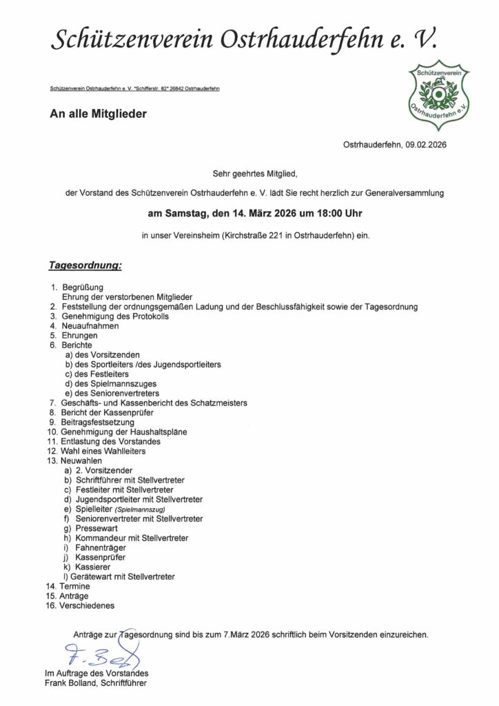 Der Schützenverein Ostrhauderfehn lädt für Samstag, den 14. März, zur Generalversammlung ein.